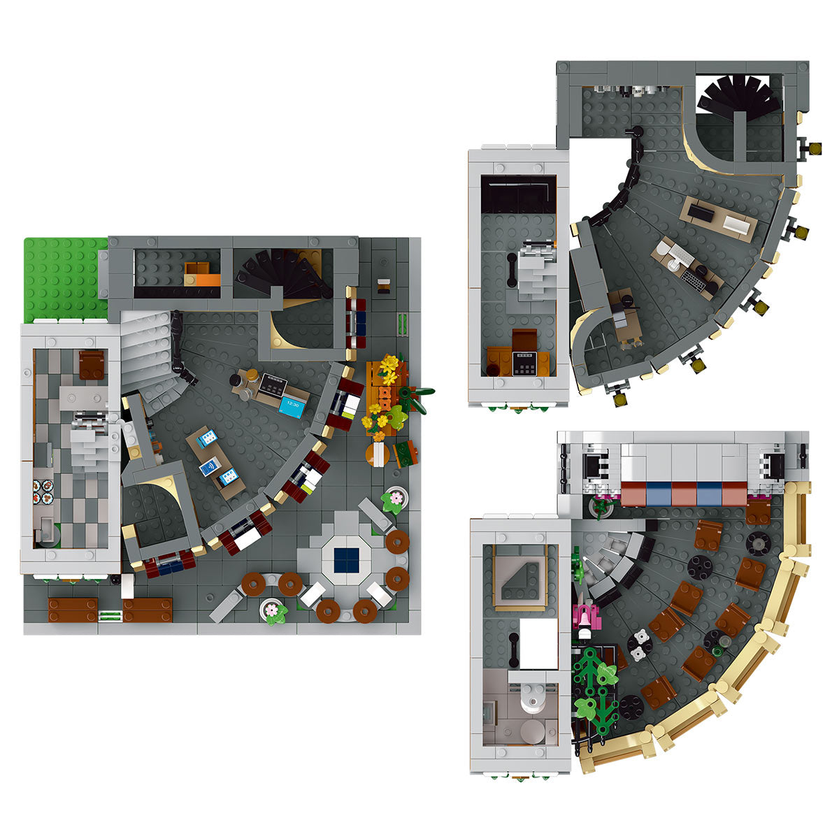 .Product Introduction: The modular building, with rounded corners and a modernist Art facade, is flanked by two narrow sections with typical 20th-century façades. To the left of the store is a narrow three-story townhouse, and to the right is the entrance to the rooftop bar. On the first floor of the large store, two long tables display a wide variety of smartphones, smartwatches, and tablets. There's a shelf filled with new devices, another wall lined with a variety of accessories, and a small storage room with a back door. On the upper floor, there are two large tables with laptops and desktops, and a wall shelf with accessories. Customers can receive support at the corner help desk. To the left of the rounded corner section is a narrow three-story townhouse. The first floor houses a kitchen with a dining area, the second floor has a large sofa and desk, and the third floor has a bedroom and bathroom. Each level is connected by a steep staircase. A separate entrance and winding staircase to the right of the corner store leads to the rooftop bar. It features a small bar with beer taps and a coffee machine. The large terrace offers ample space for sitting and enjoying the city views, even offering some shade from the greenery. The floor and roof are modular and can be pinned together with the original modules.